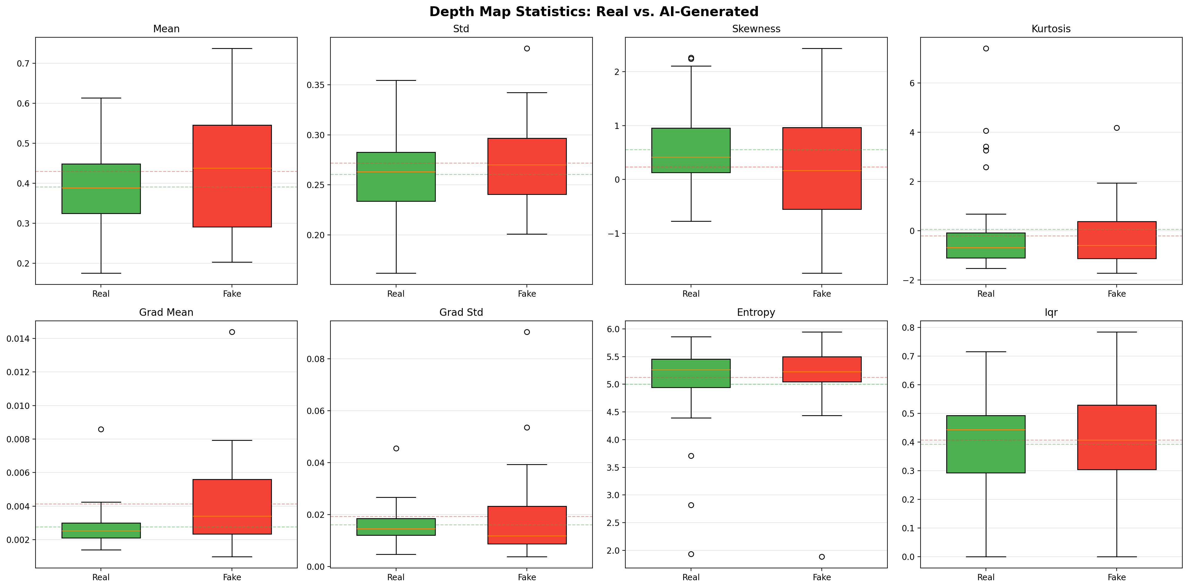 - •Key finding: AI images are paradoxically too physically consistent — overly smooth brightness-depth relationships and symmetric depth distributions